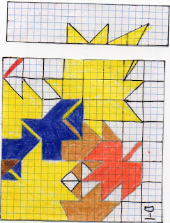 This is a portion of the "map" I am using to piece the units. I re-drew the entire pattern on graph paper and colored it with my Prismacolor pencils. Then I cut the pattern into the 64 unit blocks, and piece according to that section of the map. It has been a big help to do this, in spite of all the time it took. I can immediately spot an error.